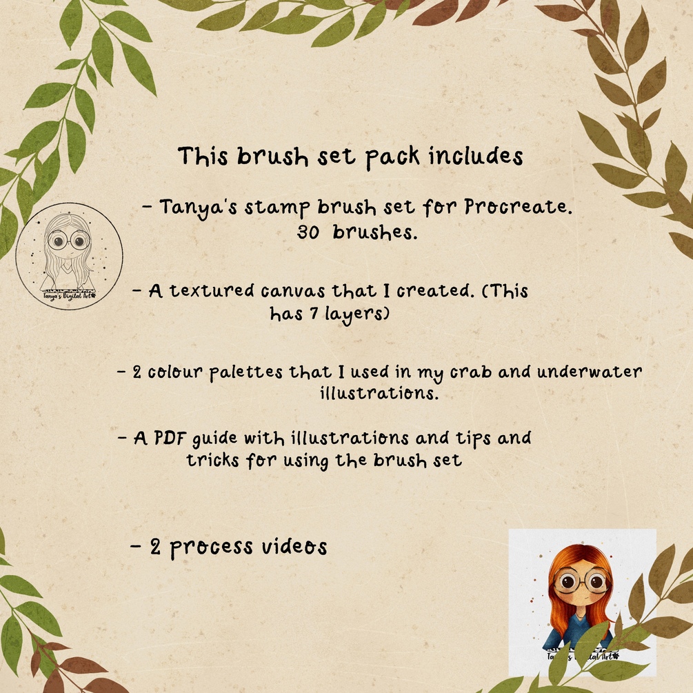 30 brushes for Procreate, 2 color palettes, , PDF with links to texture canvas.2 process videos.