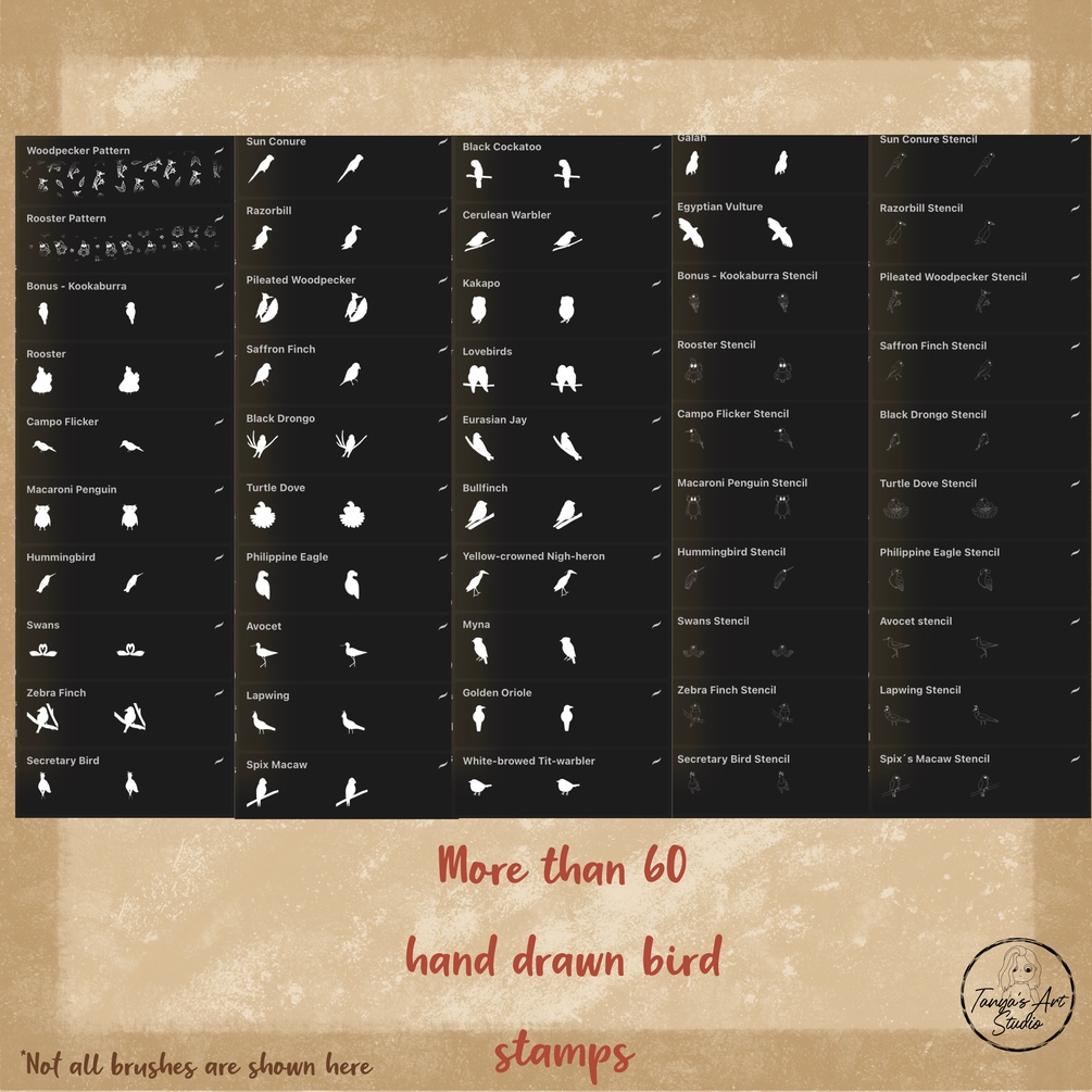 TAS bird stamp brush set for Procreate. Full set with 60+ brushes