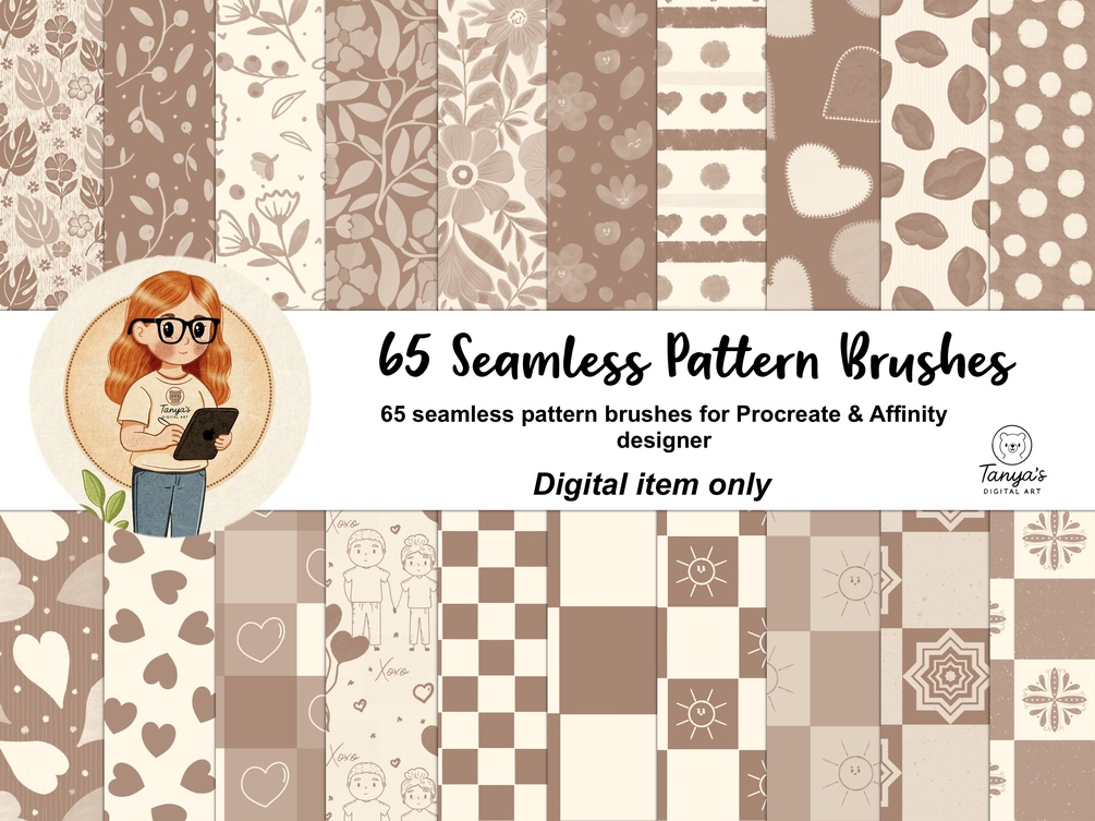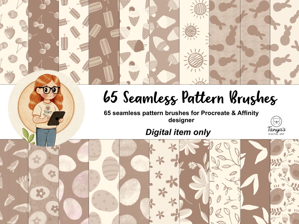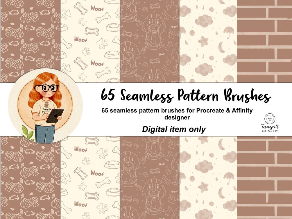 65 pattern brushes for Procreate , 65 brushes for Affinity Designer 2 , color palettes and PDF guide