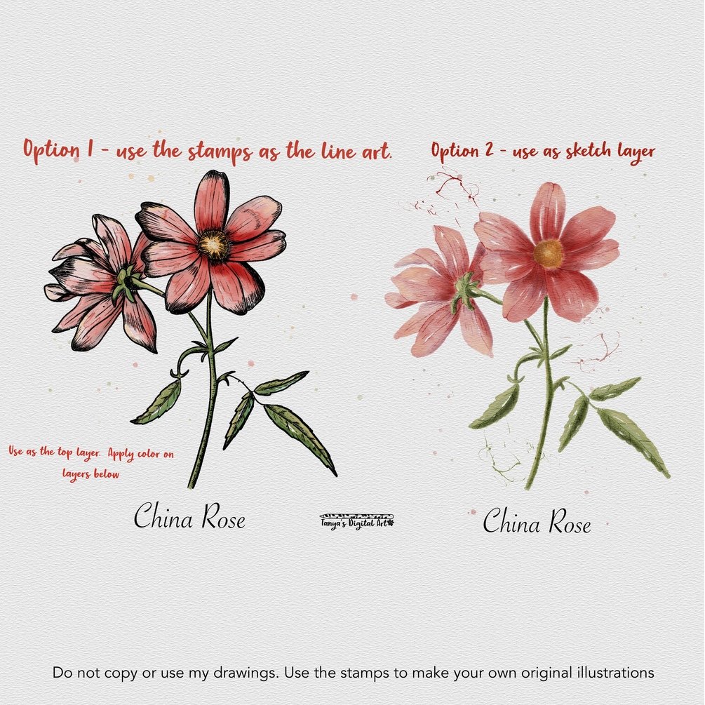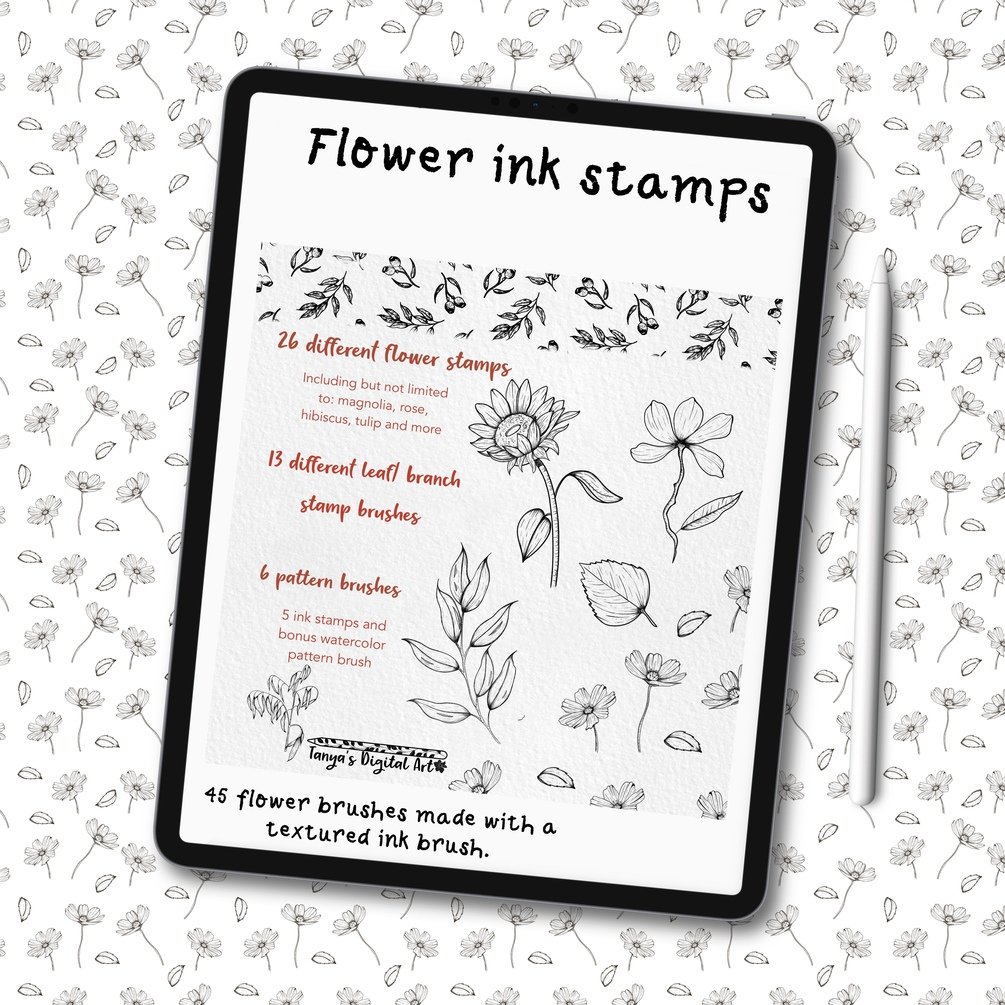 These are perfect for creating floral illustrations. Total of 45 different brushes including : 26 different flower stamps, 13 leaf/ branch stamps and 6 different pattern brushes.