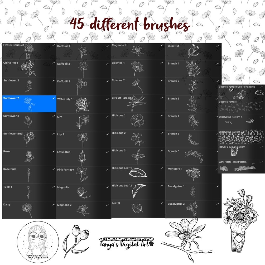 - Ink flower stamp and pattern brushesThese are perfect for creating floral illustrations. Total of 45 different brushes including : 26 different flower stamps, 13 leaf/ branch stamps and 6 different pattern brushes.