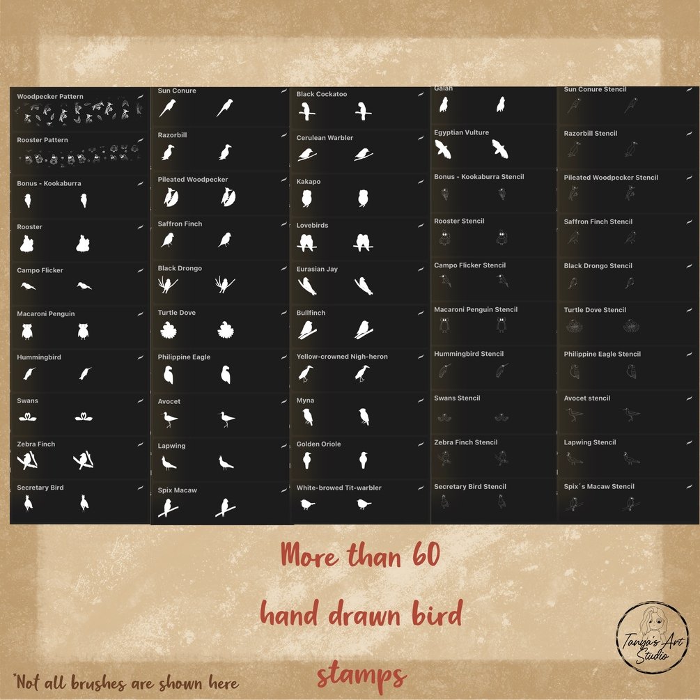 Bird stamps.This set has more than 60 brushes including at least 31 different birds plus I added 2 bonus bird pattern brushes. How to use these brushes