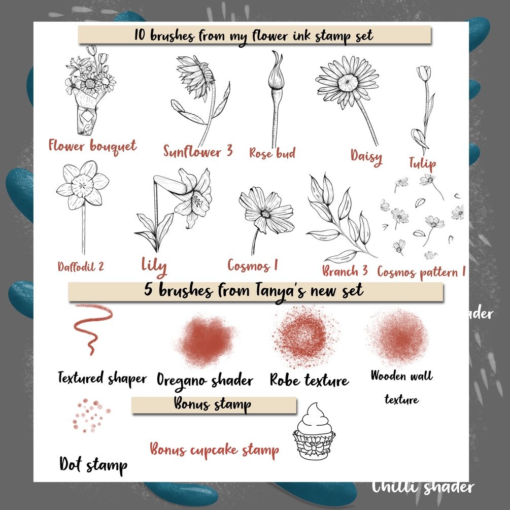 This is a mixed set of brushes from my two most popular brush sets: Tanya’s New set and Flower ink stamp brush set. If you are interested in the full sets see links below ⬇️